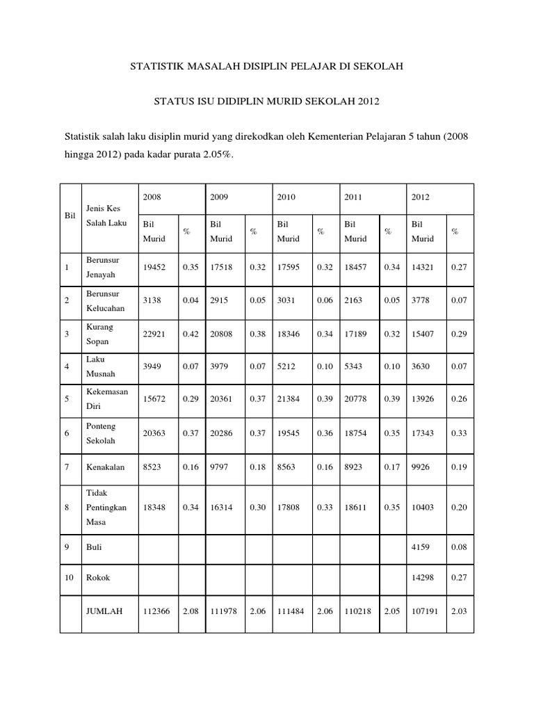 Senarai 402 Sekolah Bermasalah Disiplin Di Malaysia from i0.wp.com Ini terbukti berdasarkan statistik bilangan tindakan. Kalau misalnya masalahnya menyangkut dengan disiplin kerja di instansi atau organisasi x, maka peneliti harus menjelaskan secara rinci tentang 85. Rakan sebaya turut menjadi punca masalah. Konsep yg amat luas norma & nilai yang berhubung kait dgn tatatertib, akhlak, kesopanan, keyakinan diri dan ketabahan hati utk mengikut peraturan yg ditetapkan. Statistika adalah sebuah ilmu yang mempelajari bagaimana cara merencanakan, mengumpulkan, menganalisis, lalu menginterpretasikan, dan akhirnya mempresentasikan data. Menurut statistik, jumlah pelajar yang mengalami masalah disiplin adalah sekitar 2.03 peratus daripada jumlah keseluruhan pelajar meliputi tahun 2012 sehingga 2016. Statistik salah laku disiplin murid yang direkodkan oleh kementerian pelajaran 5 tahun (2008 hingga 2012) pada kadar purata 2.05%. Jadi, disiplin mempunyai kaitan rapat dengan kejadian disiplin pelajar yang terus merosot itu.